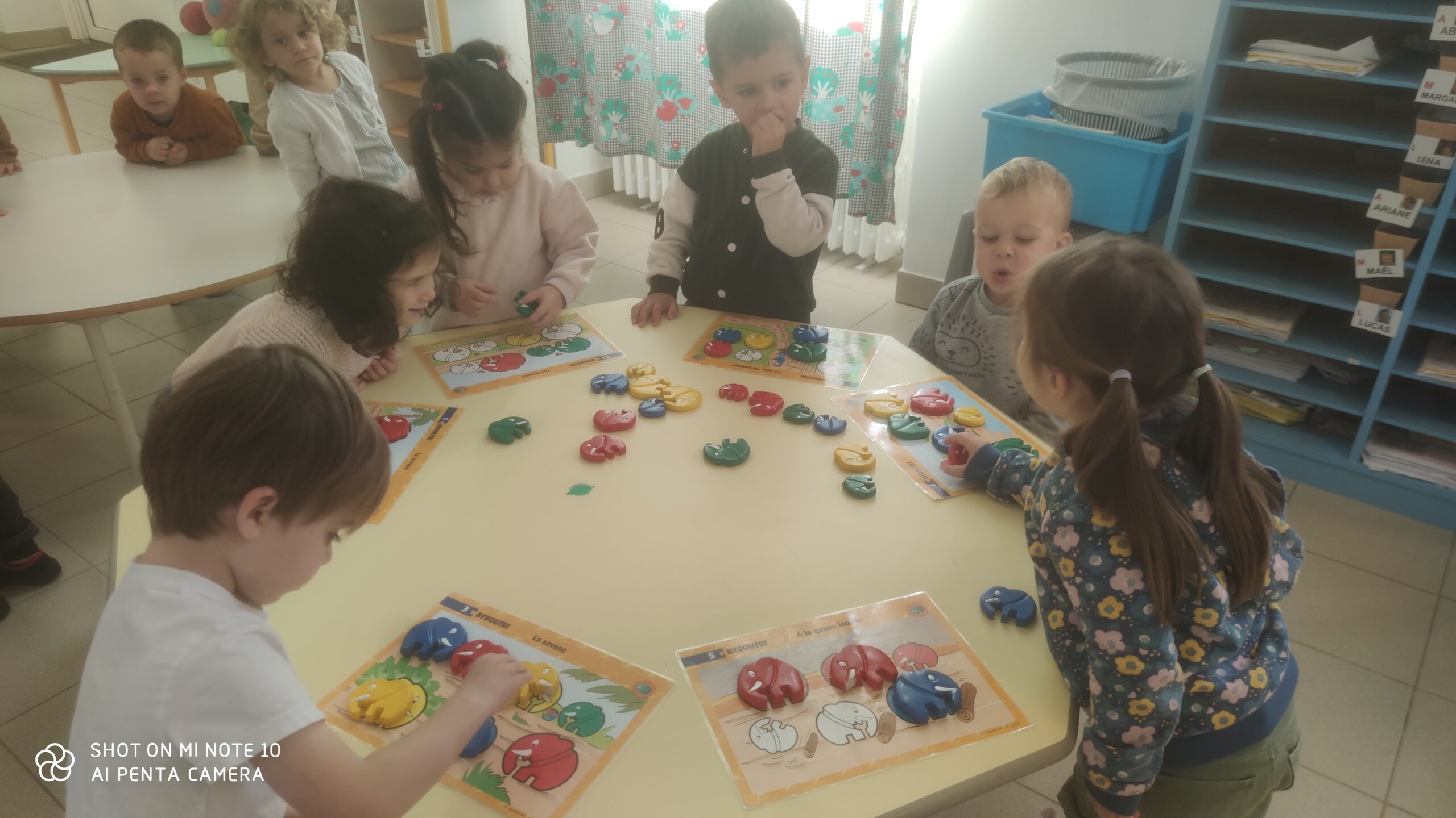 Nous apprenons la topologie avec l’atelier des éléphants. Il faut trouver le bon éléphant, taille et couleur, et le replacer dans le paysage comme le modèle.
