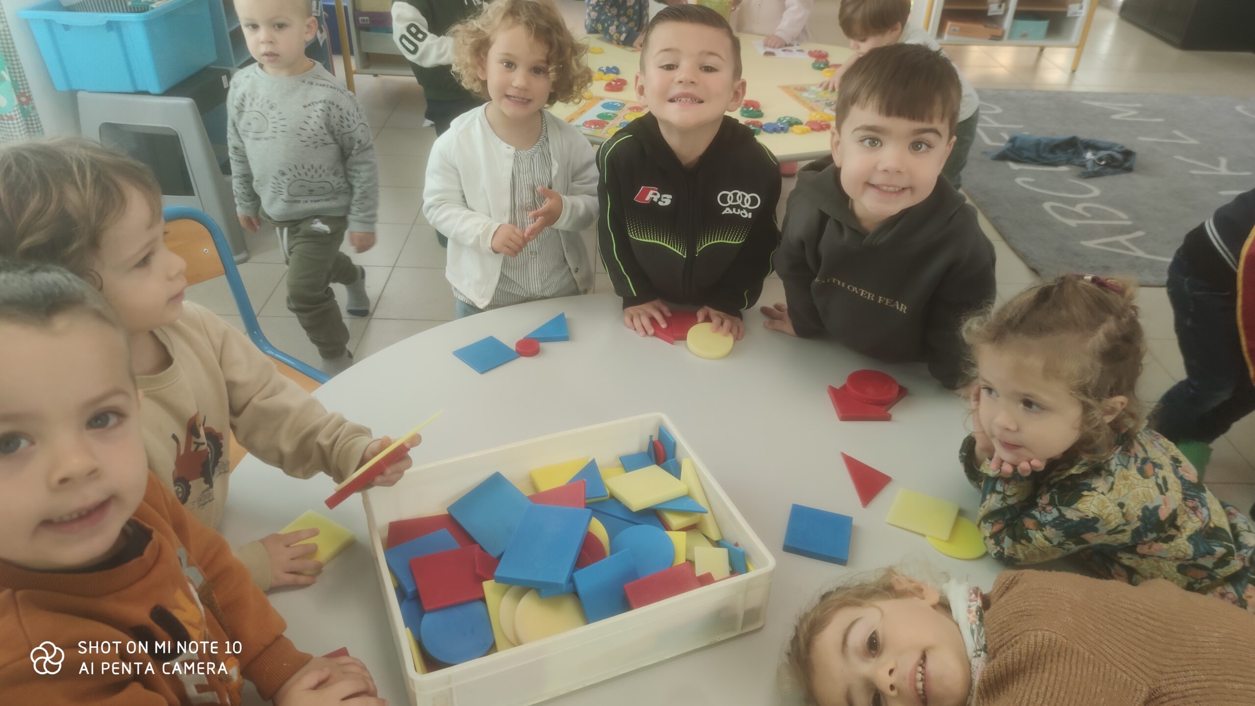 Nous essayons de reconnaître et de nommer des formes simples : carré, rond et triangle.