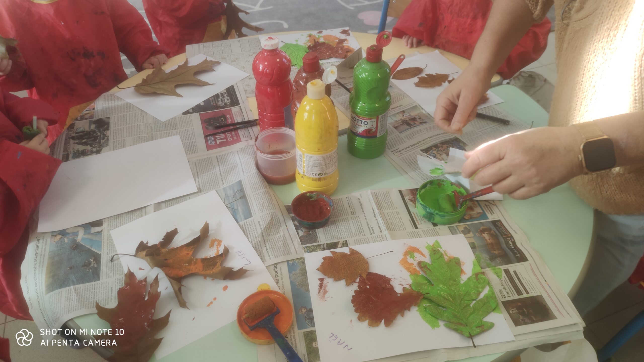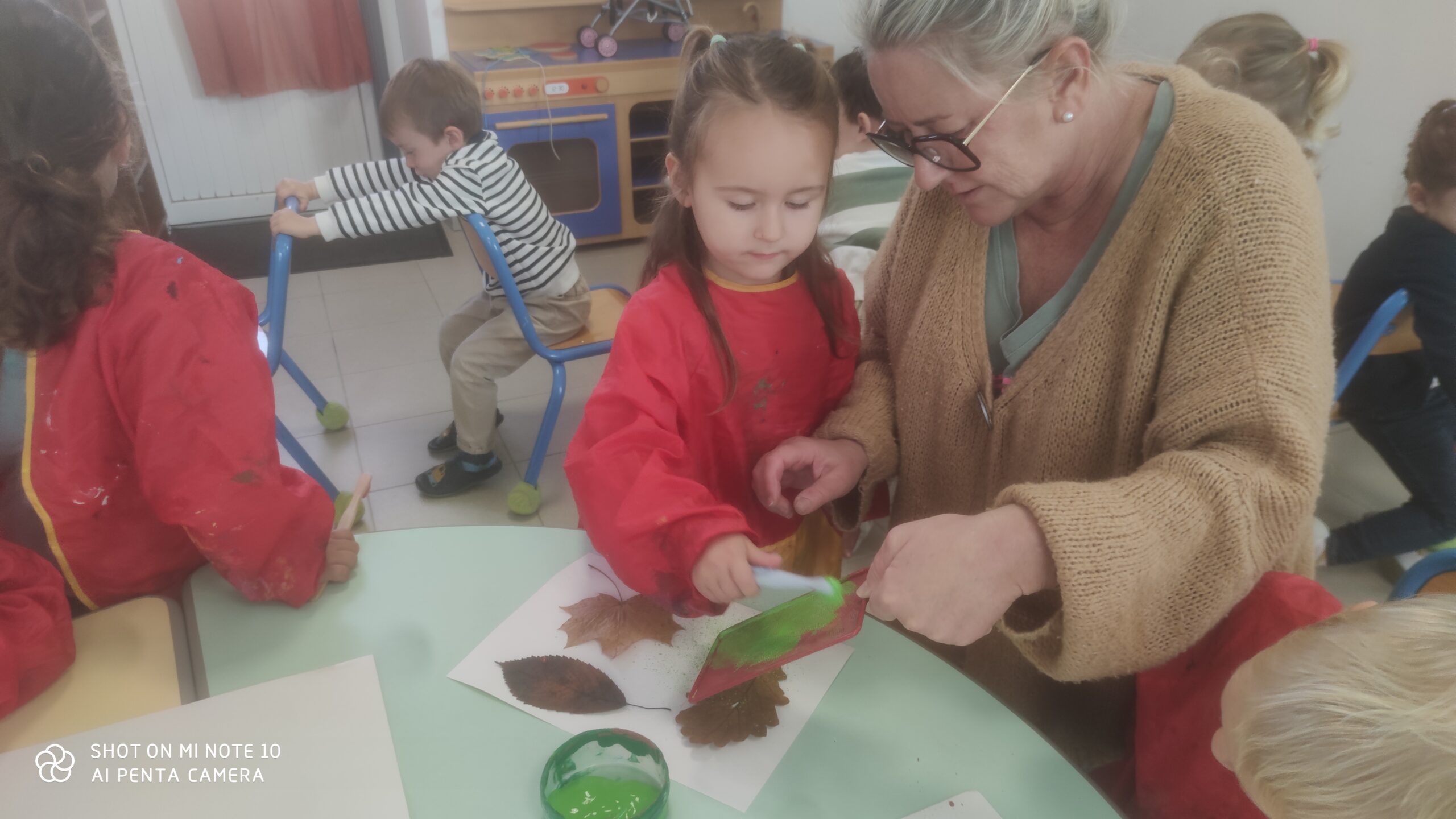 Avec Nadine, nous décorons les jolies feuilles mortes que nous avions ramassées avant les vacances.