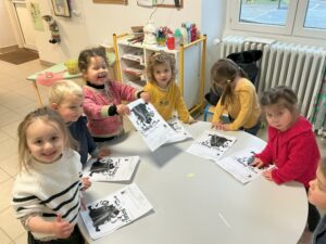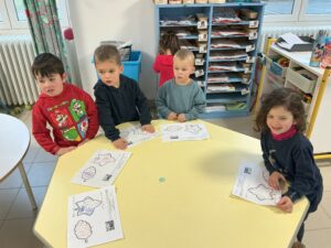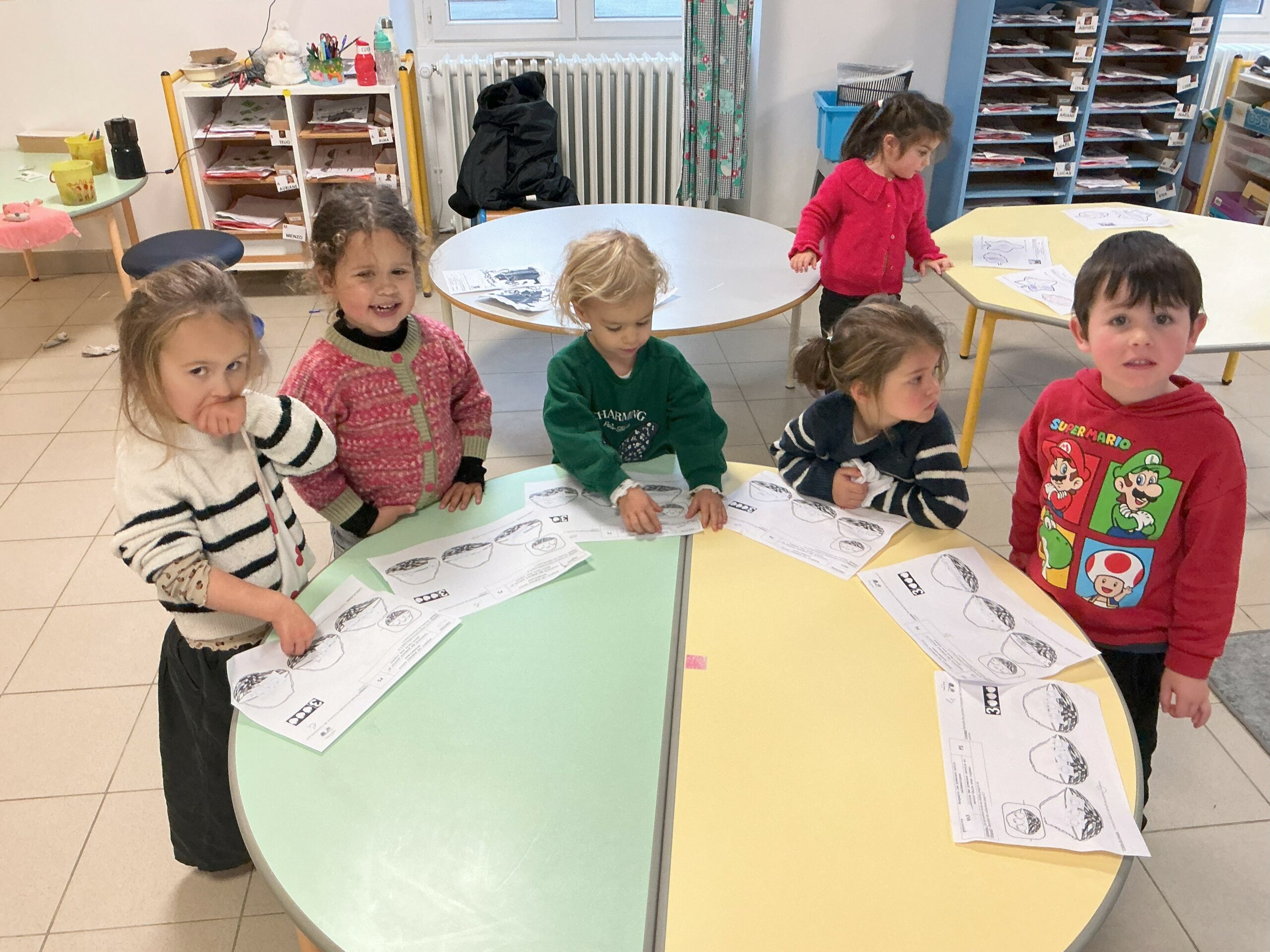 METTRE 3 pommes dans chaque panier, coloriage de SPLAT, le chat, tracer des lignes verticales, assembler coorectement les pièces de la couverture du livre JOYEUX NOËL SPLAT